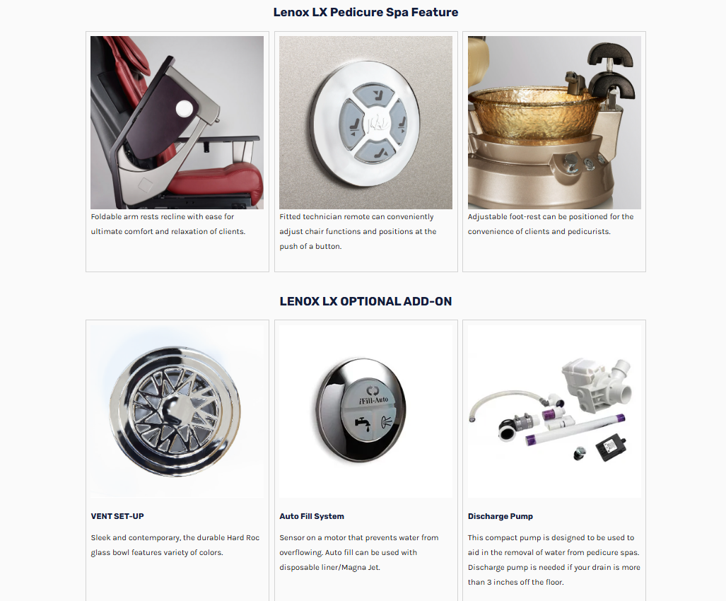 The Lenox LX marks a new generation of luxury pedicure service chairs that combine functionality and comfort. Fitted with a built-in remote, the Lenox LX is designed to deliver an immersive, full-body shiatsu massage featuring an ornate glass bowl equipped with a pipe less jet whirlpool system ensuring a truly invigorating and lasting impression.