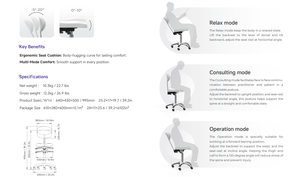 • Multi-Mode Comfort – Easily switch between Consulting, Relax, and Operation modes to suit different working needs.